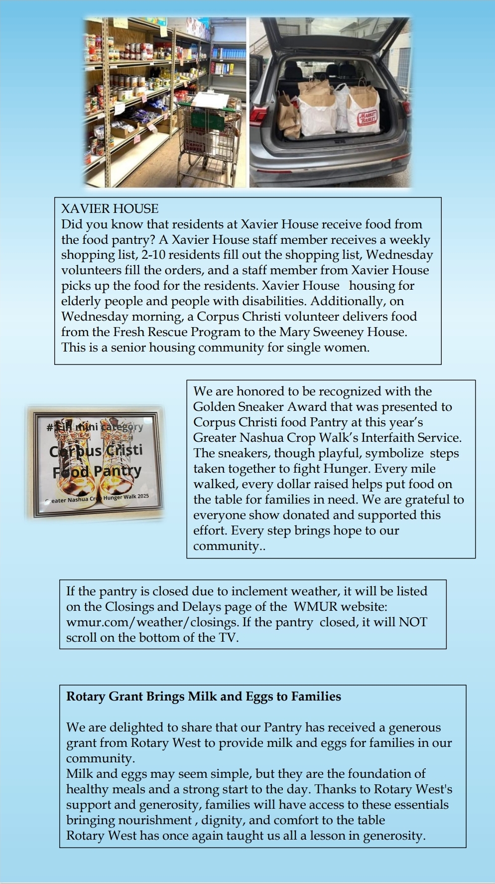 We are honored to be recognized with the Golden Sneaker Award that was presented to Corpus Christi food Pantry at this year’s Greater Nashua Crop Walk’s Interfaith Service. The sneakers, though playful, symbolize steps taken together to fight Hunger. Every mile walked, every dollar raised helps put food on the table for families in need. We are grateful to everyone show donated and supported this effort. Every step brings hope to our community.
