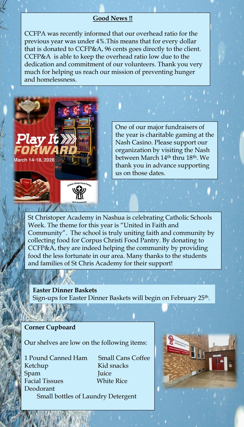 Sign-ups for Easter Dinner Baskets will begin on February 25th.