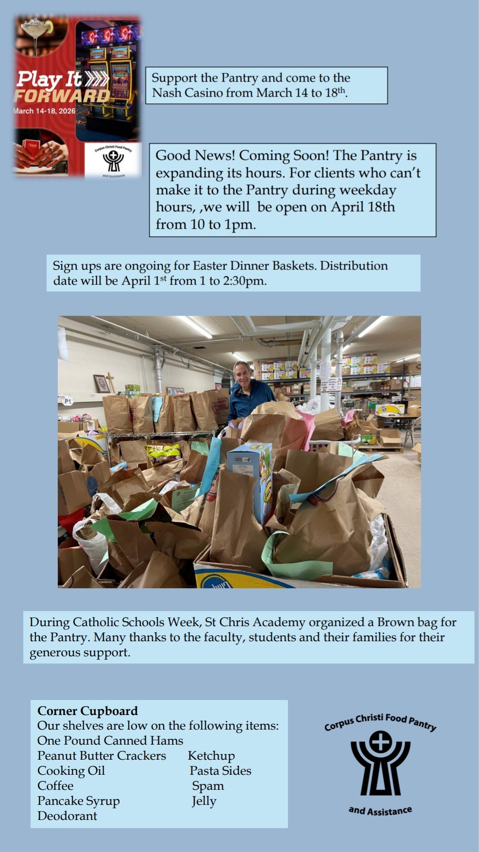 During Catholic Schools Week, St Chris Academy organized a Brown bag for the Pantry. Many thanks to the faculty, students and their families for their generous support.