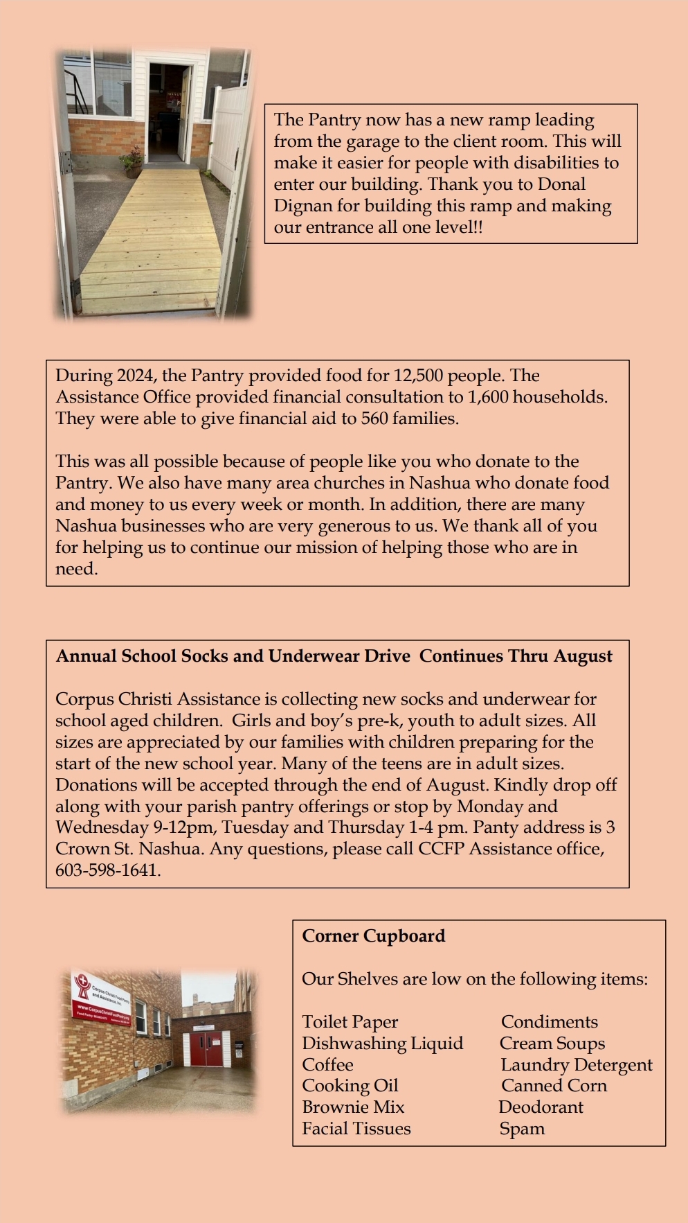 Corpus Christi Assistance is collecting new socks and underwear for school aged children.  Girls and boy’s pre-k, youth to adult sizes. All sizes are appreciated by our families with children preparing for the start of the new school year. Many of the teens are in adult sizes. Donations will be accepted through the end of August. Kindly drop off along with your parish pantry offerings or stop by Monday and Wednesday 9-12pm, Tuesday and Thursday 1-4 pm. Panty address is 3 Crown St. Nashua. Any questions, please call CCFP Assistance office, 603-598-1641.